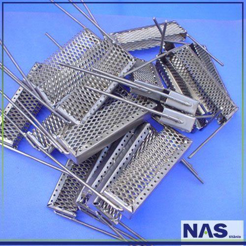 O cesto de titânio, fabricado especialmente para a indústria de galvanoplastia,pode apresentar diversos modelos, cada um a seu modo se destinando ao mesmo uso. Este acessório é formado por um elemento de fixação, que pode ser um conjunto de parafusos ou mesmo um gancho, uma malha metálica onde é depositada a peça que passará pelo processo industrial adequado. Bastante simples...